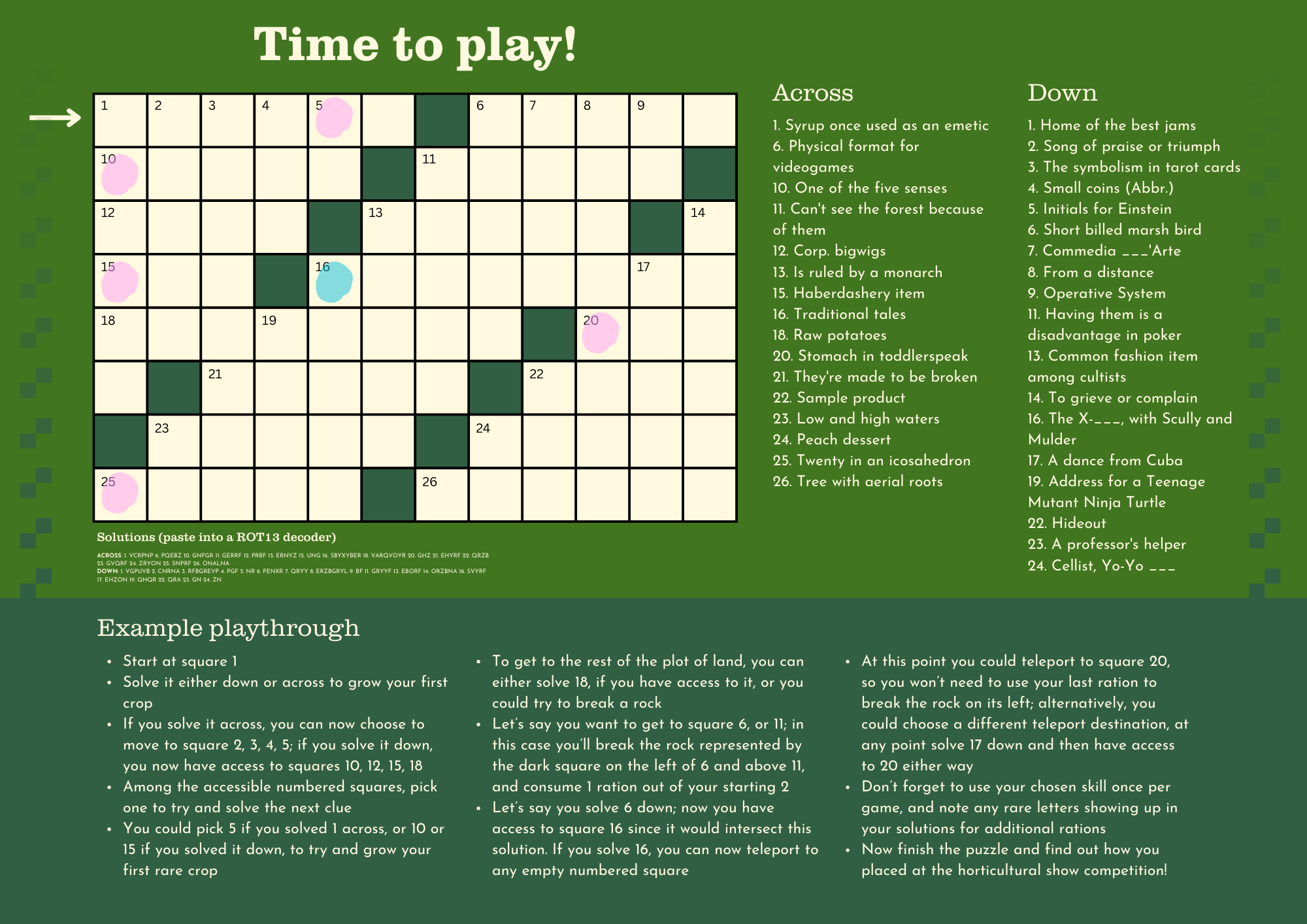 Plant crops as you solve each clue, break rocks, use rations, and try to grow as many rare plants as possible, before the Horticultural Competition Show judges show up to evaluate how green your thumb is!