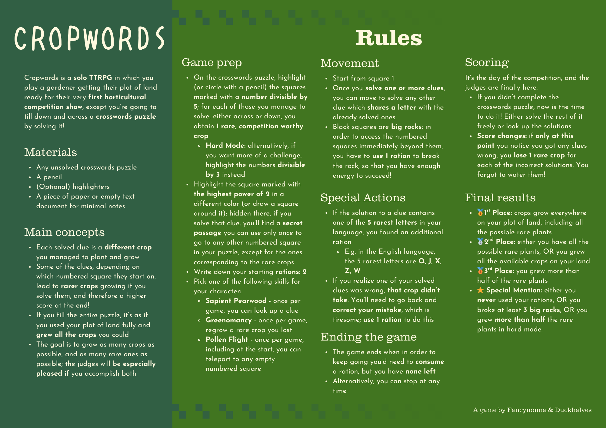| Tags | Cozy, crossword, crosswords, One-page, pen-and-paper, Solo RPG, Tabletop, Tabletop role-playing game |